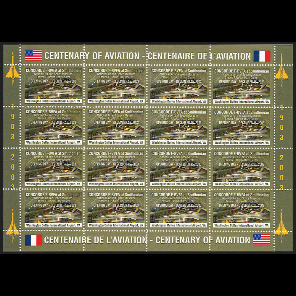 N°CO-RET16FD : Feuillet de 16 vignettes DENTELÉES, gommées “Centenaire de l’Aviation 1903-2003 - Transfert de Concorde Air France F-BVFA Smithonian Museum Washington DC (USA)“