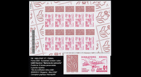 N°A380-27N3F : FRANCE 2006 - FEUILLET COLLECTOR de 10 TIMBRES PERSONNALISÉS ADHÉSIFS 0,86€ lilas-brun "Marianne de Lamouche" à grande vignette attenante "Vols de certification de l'Airbus A380 - Mission 01 - SINGAPORE - SEOUL 2006"