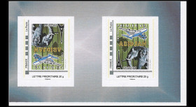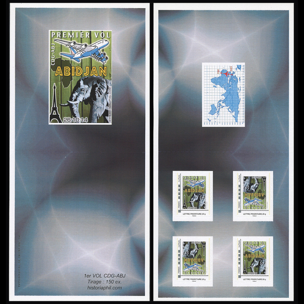 N°A380-255C : Carnet Collector FRANCE 2014 de 4 Timbres-poste personnalisés (TPP) Lettre prioritaire 20g TÊTE-BÊCHE à fond VERT "26.10.2014 - Premier vol Airbus A380 Air France Paris CDG (France) - Abidjan ABJ (Côte d'Ivoire) / Tour Eiffel , éléphant et carte d'Afrique"