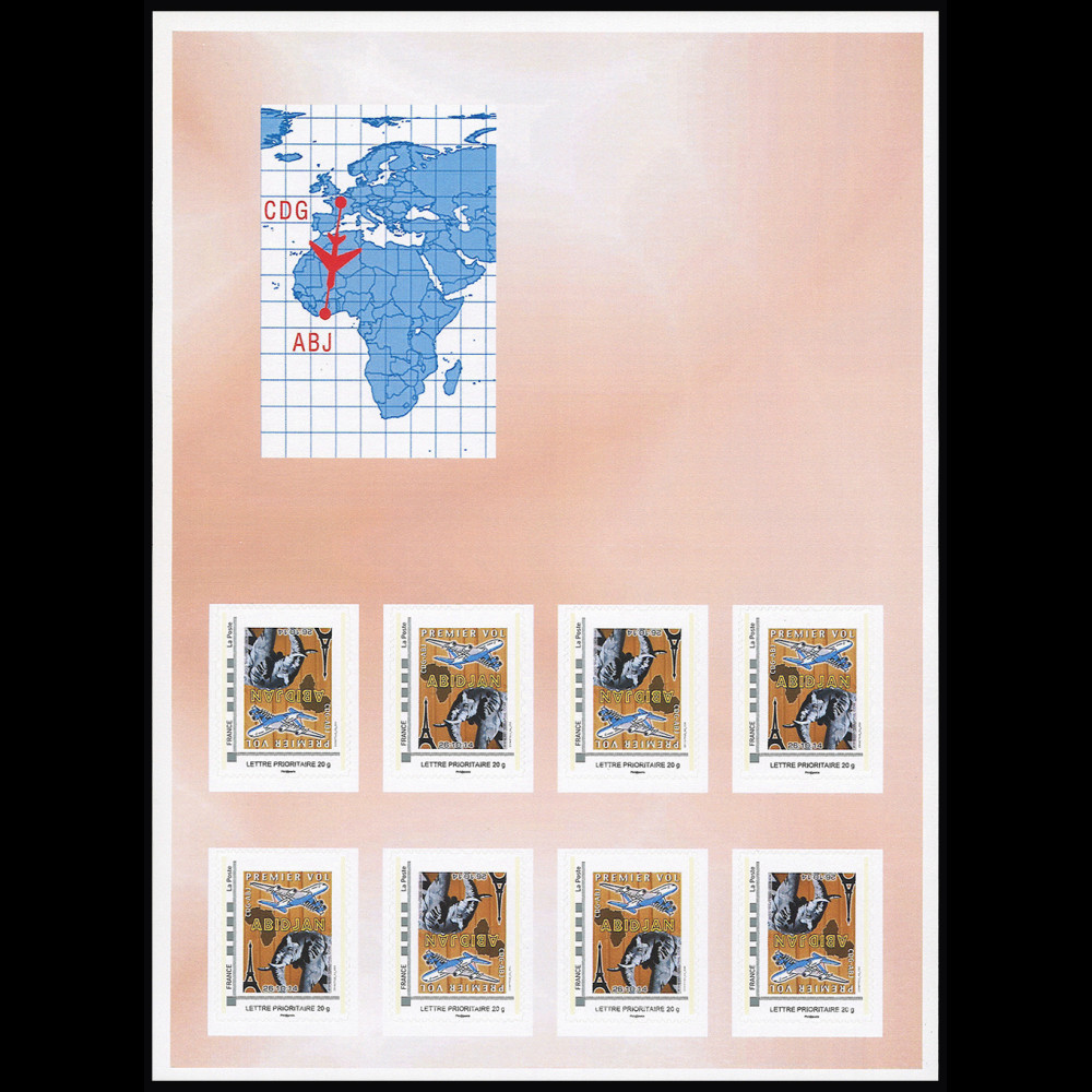 N°A380-256C8 : Carnet Collector FRANCE 2014 de 8 Timbres-poste personnalisés (TPP) Lettre prioritaire 20g TÊTE-BÊCHE à fond JAUNE "26.10.2014 - Premier vol Airbus A380 Air France Paris CDG (France) - Abidjan ABJ (Côte d'Ivoire) / Tour Eiffel , éléphant et carte d'Afrique"