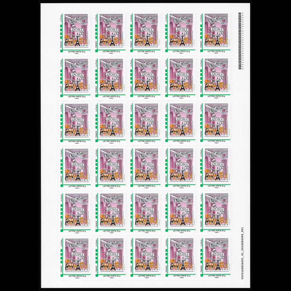 N°A380-284P : FRANCE 2014 - Planche Collector de 30 Timbres-Poste Personnalisé (TPP) Lettre Verte 20g à fond ROSE "05.11.2014 - 1er vol Airbus A380 Qatar Airways Paris CDG (France) - Doha DOH (Qatar) / Tour Eiffel et oryx"