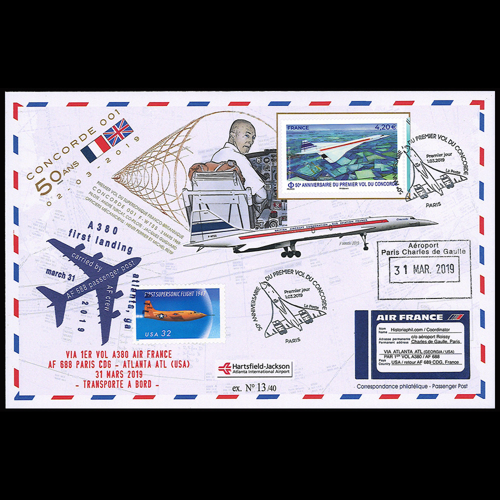 En commémoration des "50 ans du 1er vol de Concorde 001", les éditions Historiaphil, en collaboration avec le Personnel navigant d'Air France, ont conçu une série de plis aérophilatéliques transportés à bord du premier vol Paris (France) - Atlanta (USA) de l'Airbus A380 d'Air France.
