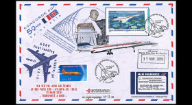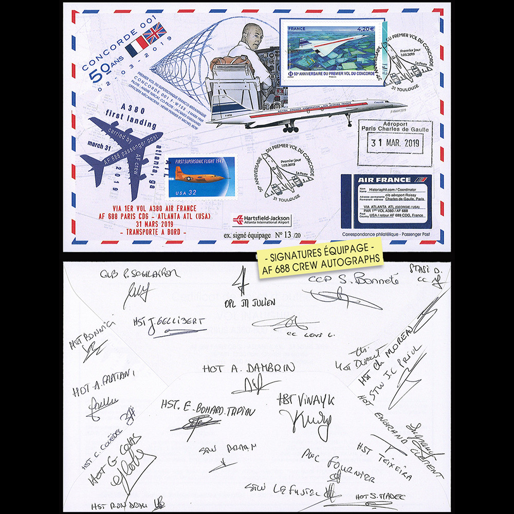 Un nombre très limité de plis aérophilatéliques, réalisés pour le “50e anniversaire du premier vol de Concorde“, a été transporté à bord et signé par les 23 membres d’équipage de l’A380 d’Air France ayant effectué le premier vol AF 688 Paris CDG - Atlanta ATL du 31 mars 2019.