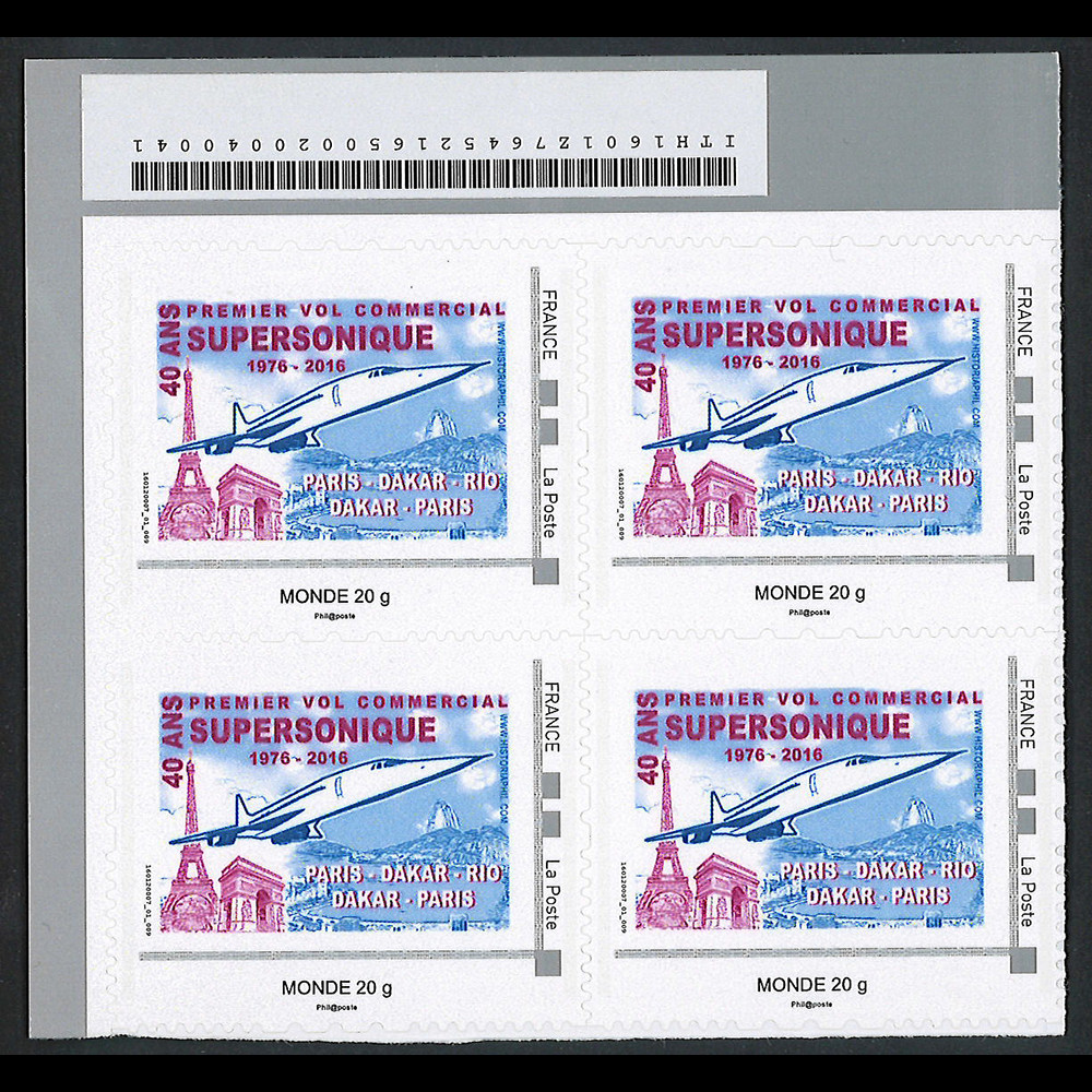 N°CO-RET58B4 : FRANCE 2016 - Bloc de quatre timbres-poste personnalisés Lettre Monde 20g (coin de feuille) “21.01.1976-2016 : 40e anniversaire des Premiers vol commerciaux supersoniques du CONCORDE Air France AF 085 Paris (France) - Rio de Janeiro (Brésil) - Tour Eiffel & Arc de Triomphe"