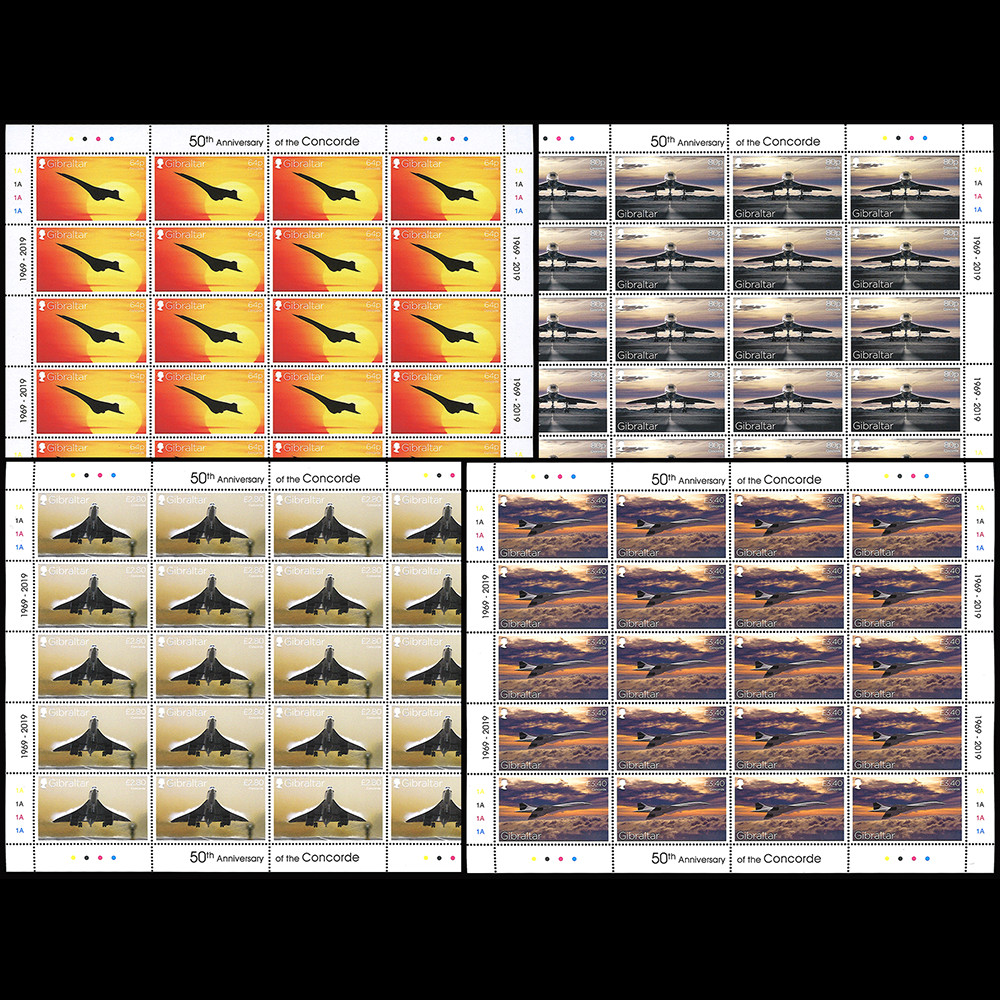 N°CO-RET94F: 2019 GIBRALTAR (United Kingdom) series 64p, 80p, £2.80, £3.40 “50 years of the First Flight of the Franco-British Supersonic CONCORDE F-WTSS (001) on March 1, 1969 in Toulouse (Aérospatiale, France) and G-BSST (002) on April 9, 1969 in Filton (British Aircraft Corporation, United Kingdom) / 4 sheetlets of 20 stamps (MNH).