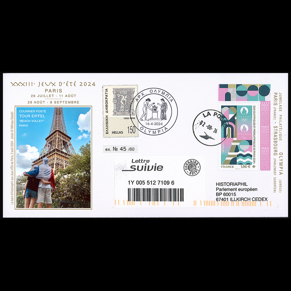 Des enveloppes philatéliques inédites, acheminées depuis Olympie (Grèce), jusqu’à Paris (France) ont été réalisées en très petits tirages par Historiaphil© (Kiosque de Philatélie du Parlement européen, Strasbourg) pour célébrer cet événement historique.