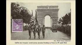 Libération de Paris, août 1944 25 août 1944 : La 2e D.B. du général Leclerc entre dans Paris, de Gaulle s'installe au ministère de la guerre. 31 août 1944 : Le gouvernement Provisoire d'Alger est transféré à Paris. 1ère surcharge de la Libération de Paris : Timbres de service émis par les F.F.I. et utilisés par eux pour le courrier transporté par motocycliste. Une seule valeur : 1,50 Pétain surchargé d'une Croix de Lorraine. Ce timbre était accompagné d'une vignette bleue grand format à l'éffigie du général de Gaulle.. Oblitération par cachet F.F.I. Les enveloppes ainsi affranchies furent collectées après la Libération et vendues le 13 novembre 1944 au profit des F.F.I.