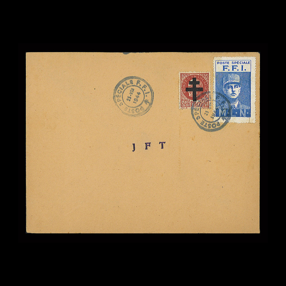 Affranchissement France 1,50F Pétain surchargé «Croix de Lorraine» + vignette bleue «de Gaulle / poste spéciale FFI - MLN»