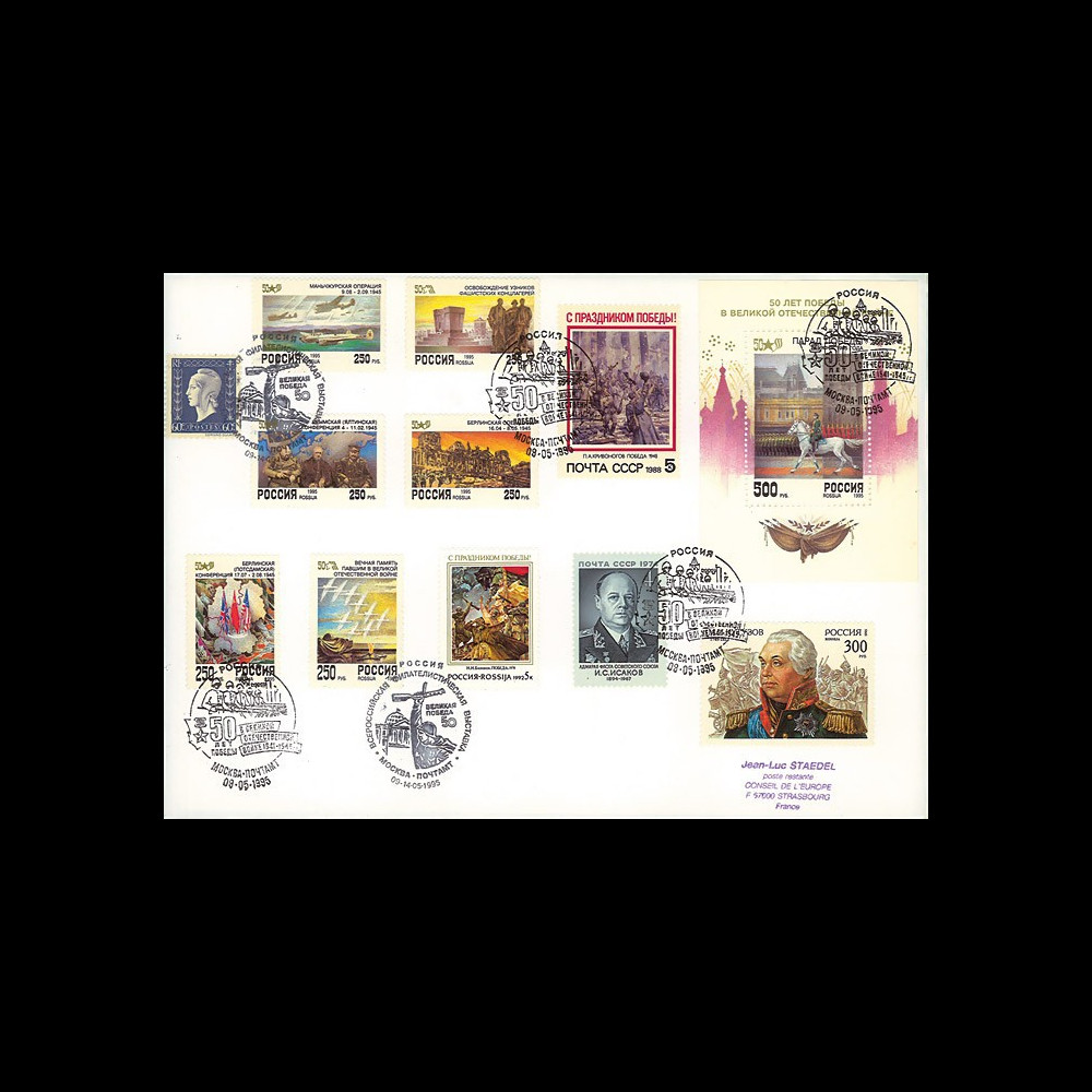+ série Russie 6 valeurs et 1 bloc “50 ans Victoire” + autres timbres russes “2e Guerre Mondiale”. Oblit. GF Moscou (2 types) “50e anniversaire de la Victoire du 9 mai 1945” 9.5.95