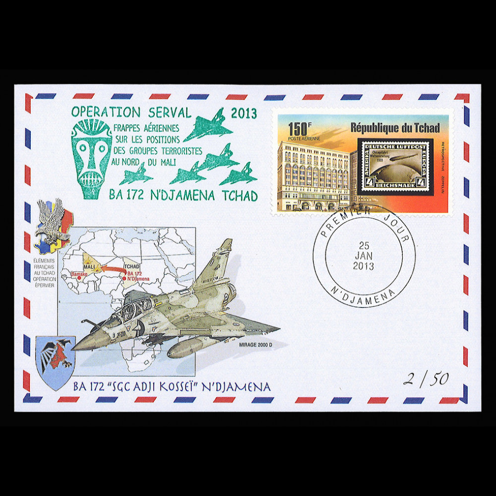 + cachet vert N'Djamena "OPERATION SERVAL 2013 / BA 172 N'Djamena Tchad : MIRAGE 2000 D - Frappes aériennes sur les positions des groupes terroristes au Nord du Mali" (Tchad)