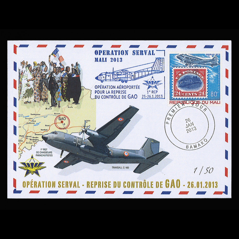 + cachet bleu Gao "OPÉRATION SERVAL MALI 2013 / Opération aéroportée pour la reprise du Contrôle de Gao - Avion Transall C-160 & 1er RCP" (Mali) 25-26.1.2013