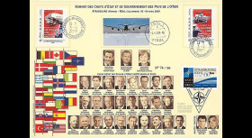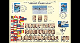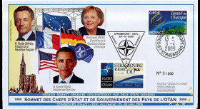N°OTAN09-3/6C : 3.4.2009 : émission de 4 timbres-poste personnalisés français (IDtimbre© Entreprise) 'Air Force One et Marine One - Sommet de l'OTAN Strasbourg - Kehl' en planches de 30 timbres adhésifs 46 x 36 mm.