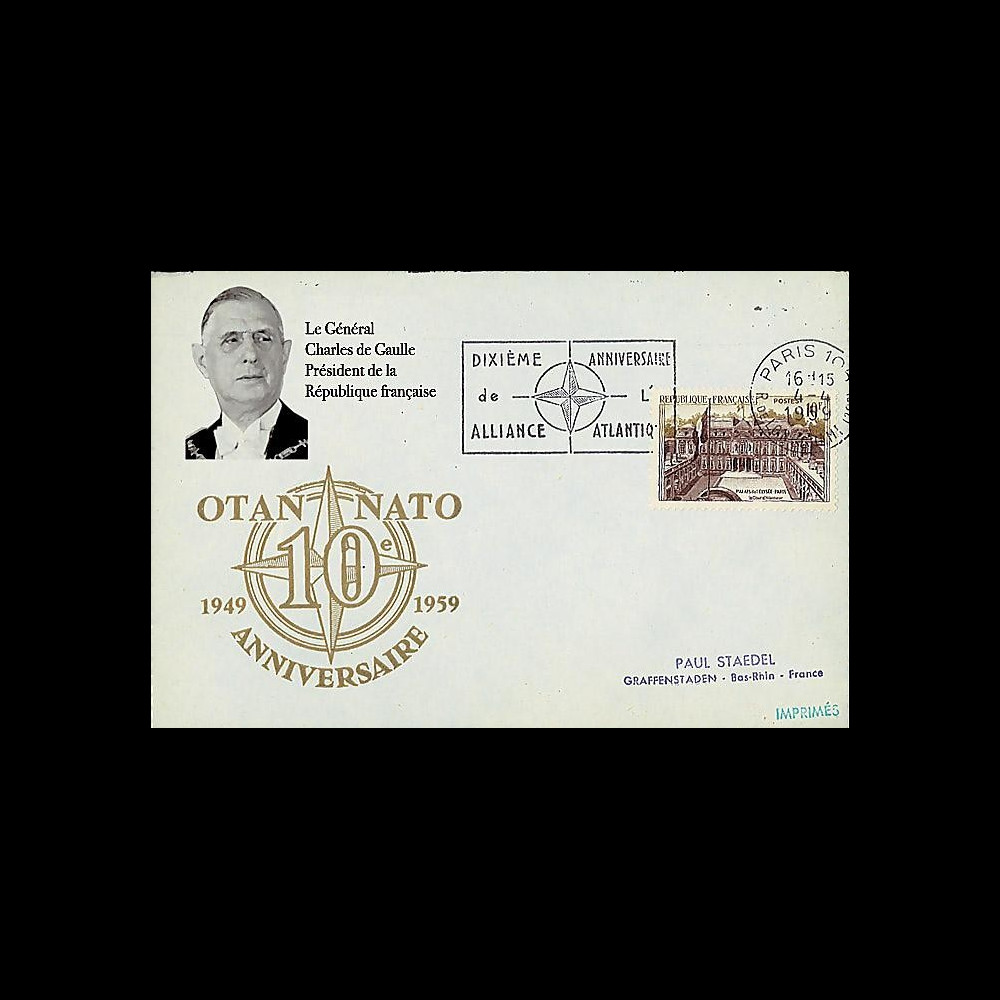 N° OTAN14-1 : Pli spécial France 'Président Charles de Gaulle', flamme spéciale '10e anniversaire de l'Alliance Atlantique' Paris 4.4.59' sur 10F 'Palais de l'Elysée' Rare (OTAN = Organisation du Traité de l'Atlantique Nord)