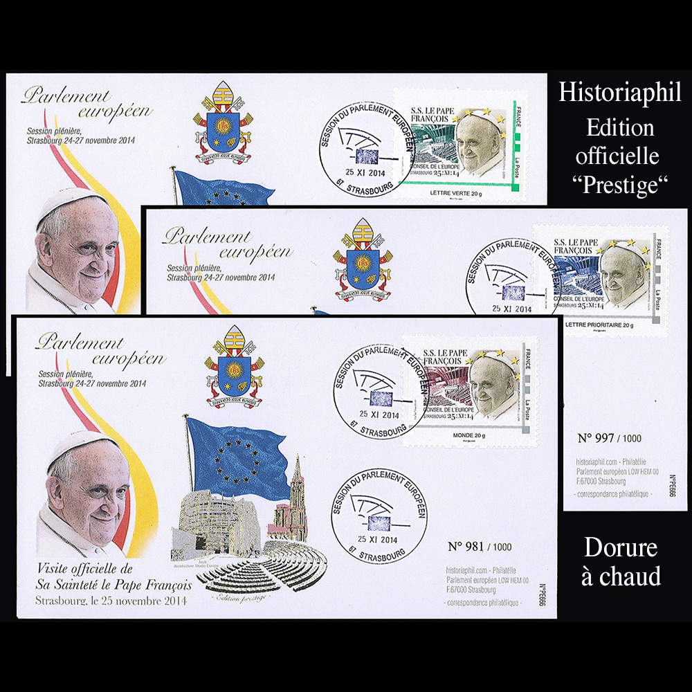 PE666-T3 : Série de 3 FDC (enveloppes) Edition Prestige France "Session du Parlement européen, Strasbourg 24-27.11.2014 - Visite officielle de Sa Sainteté le PAPE FRANÇOIS (25 novembre) - Timbres personnalisés officiels"