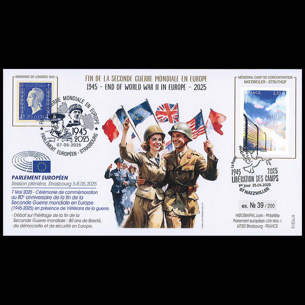 - cachet philatélique "Parlement européen Strasbourg - Fin de la 2e Guerre Mondiale en Europe 1945-2025 - Churchill et de Gaulle - 07.05.2025"