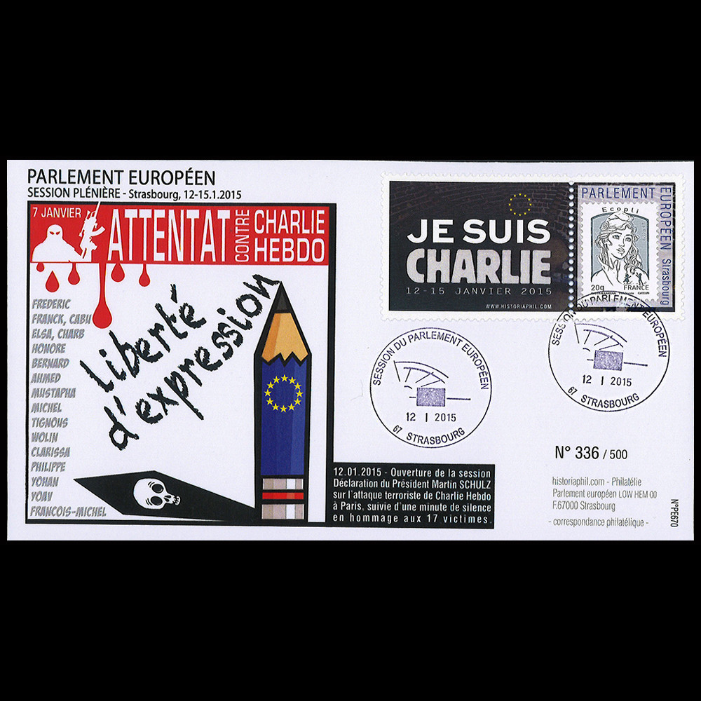 - Affranchissement France TVP Eco 20g gris (ou TVP 20g prio rouge) "Marianne et la Jeunesse, 2015" sur porte-timbre dentelé "Parlement européen 12-15.01.2015 - JE SUIS CHARLIE"