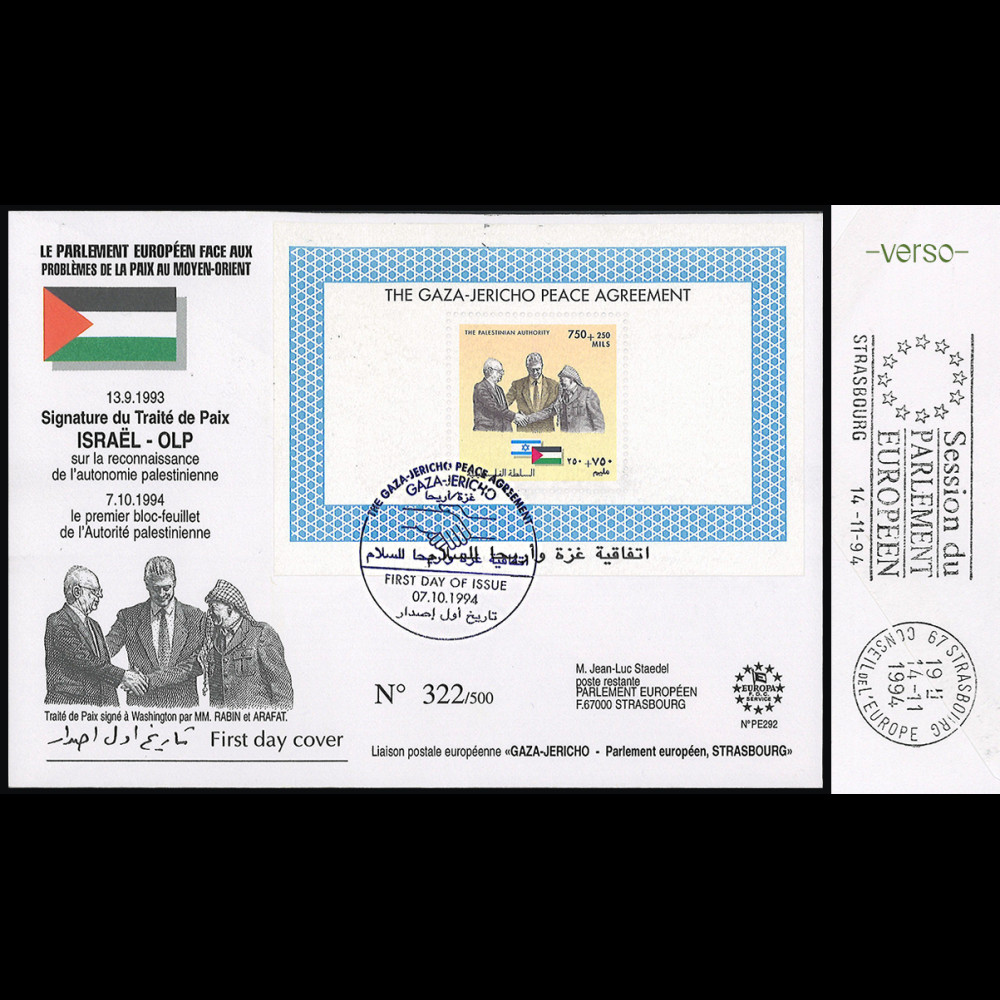 - Affranchissement Autorité Palestinienne (Palestine) Bloc 750+250 Mils “The Gaza - Jericho Peace Agreement - Y. Rabin, Y. Arafat, B. Clinton - Drapeaux d'Israël et de Palestine” (Nota : 1er bloc-feuillet de l'Autorité Palestinienne!)