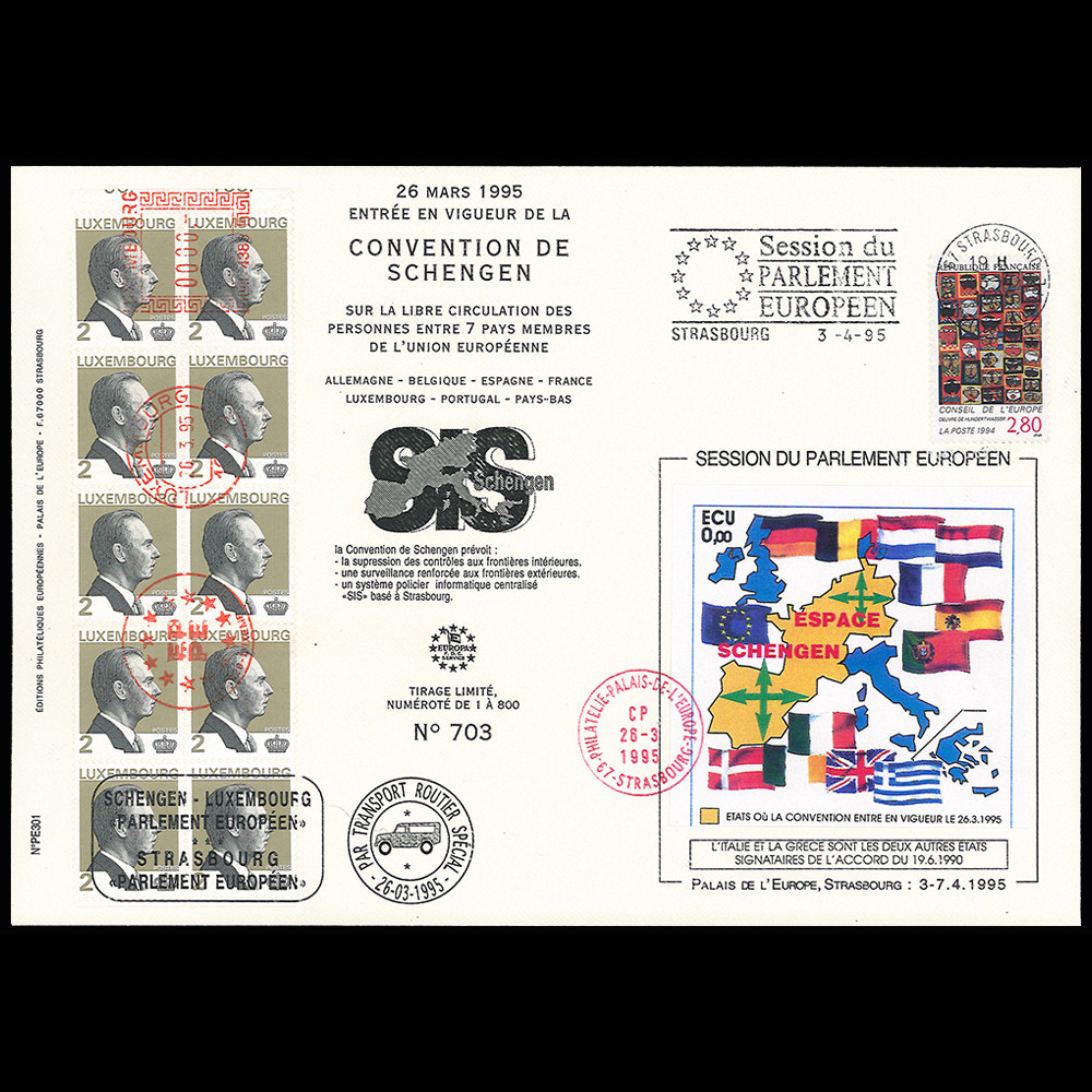 Liaison postale philatélique par transport routier spécial "Schengen - Luxembourg (Parlement européen) - Strasbourg (Parlement européen)"