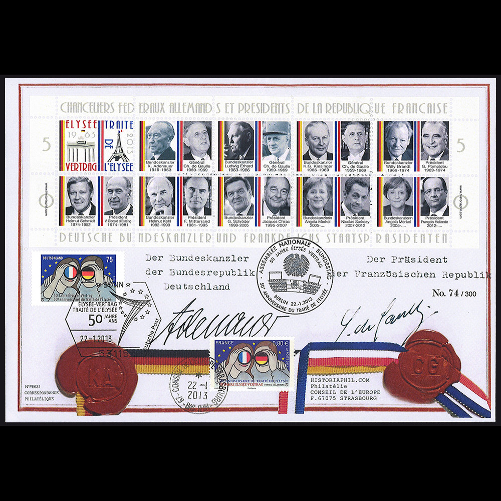 + feuillet de 10 vignettes dentelées et gommées "Chanceliers fédéraux allemands et présidents de la République française : Adenauer / de Gaulle - Erhard / de Gaulle - Kiesinger / de Gaulle - Brandt / Pompidou - Schmidt / Giscard d’Estaing - Kohl / Mitterrand - Schröder / Chirac - Merkel / Sarkozy - Merkel / Hollande"