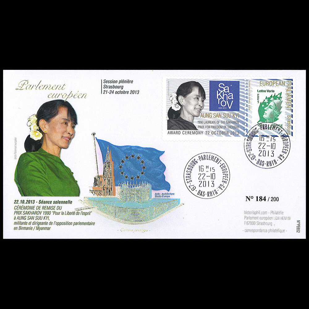 N°PE652-T1 : FDC 'Edition Prestige' Session plénière du Parlement européen de Strasbourg (France) 21-24.10.2013 "22.10.2013 : Cérémonie de Remise du Prix SAKHAROV 1990 'Pour la Liberté de l'esprit' à Mme AUNG SAN SUU KYI, Militante et Dirigeante de l'opposition parlementaire en Birmanie / Myanmar" 2013 :