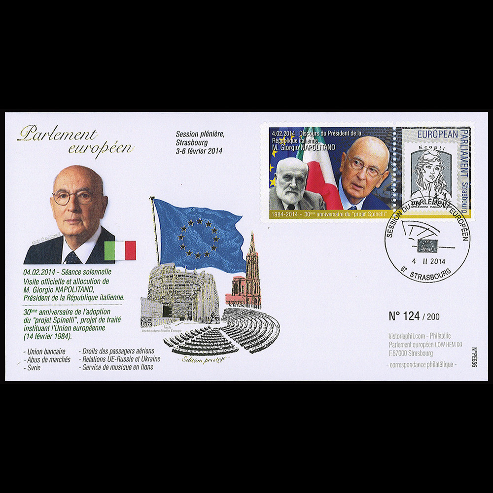 - Affranchissement France Lettre eco 20g "Marianne et la Jeunesse" sur porte-timbre dentelé "Parlement européen, Strasbourg 04.02.2014 - Discours de M. Giorgio NAPOLITANO, Président de la République d'Italie"