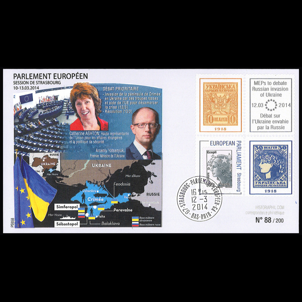 Affranchissement France 1 valeur Ecopli 20g grise "Marianne et l'Europe, 2013" sur porte-timbre privé "12.03.2014, Parlement européen de Strasbourg Débat sur l'Ukraine envahie par la Russie / Premiers timbres de l'Indépendance de l'Ukraine (1918)" oblitération tàd Strasbourg "Parlement européen" (France) 12.3.2014