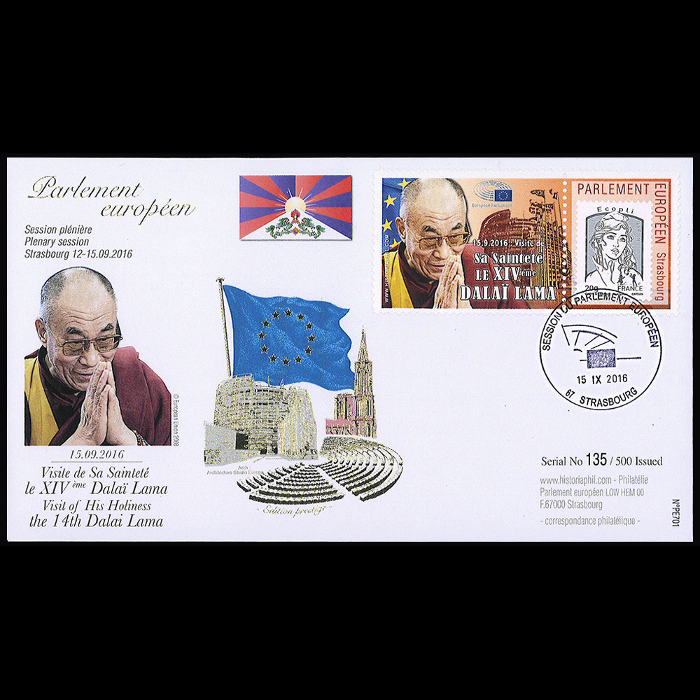 PE701-T1 : FDC (enveloppe) Edition Prestige "Session plénière du Parlement européen, Strasbourg 12-15.09.2016 - Visite officielle de Sa Sainteté le XIVème DALAÏ LAMA (Tibet), 15 novembre - Type 1 Marianne Eco, cachet illustré"
