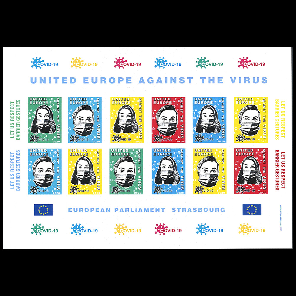 Le Kiosque de Philatélie du Parlement européen de Strasbourg à conçu un feuillet de 12 vignettes “L'Europe unie contre le virus - Respectez les gestes barrière" pour sensibiliser le public dans la lutte contre la pandémie du C-19.