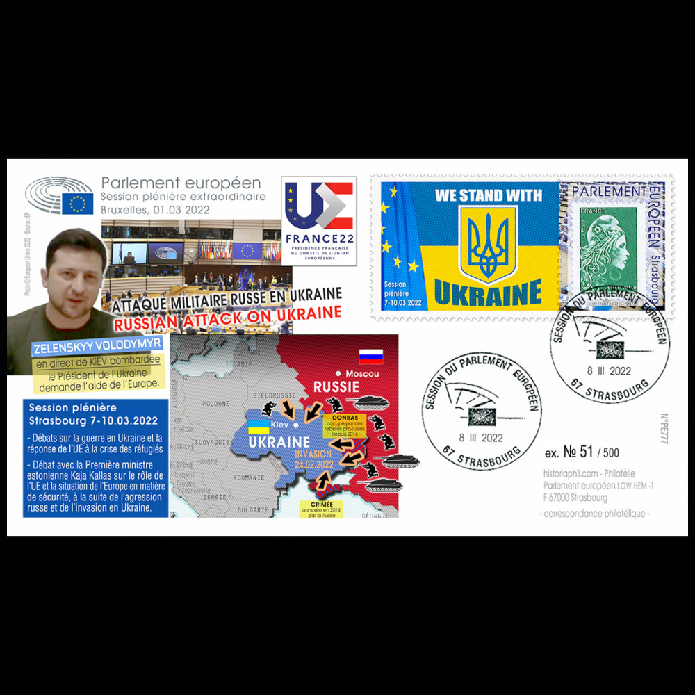 - Affranchissement FRANCE TVP Marianne Lettre Verte sur porte-timbre dentelé “Parlement européen Strasbourg 7-10.03.2022 - WE STAND WITH UKRAINE (Nous sommes avec l'Ukraine)"