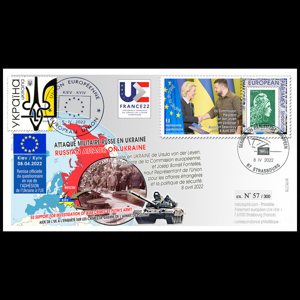 A FRANCE - UKRAINE philatelic envelope, designed by Historiaphil© (Philately Kiosk of the European Parliament, Strasbourg, France) commemorates the highlights of this historic visit. It was produced as a continuation of the collection of philatelic envelopes testifying since 1949 to the history of Europe and its institutions. Its edition is limited to 300 numbered copies.