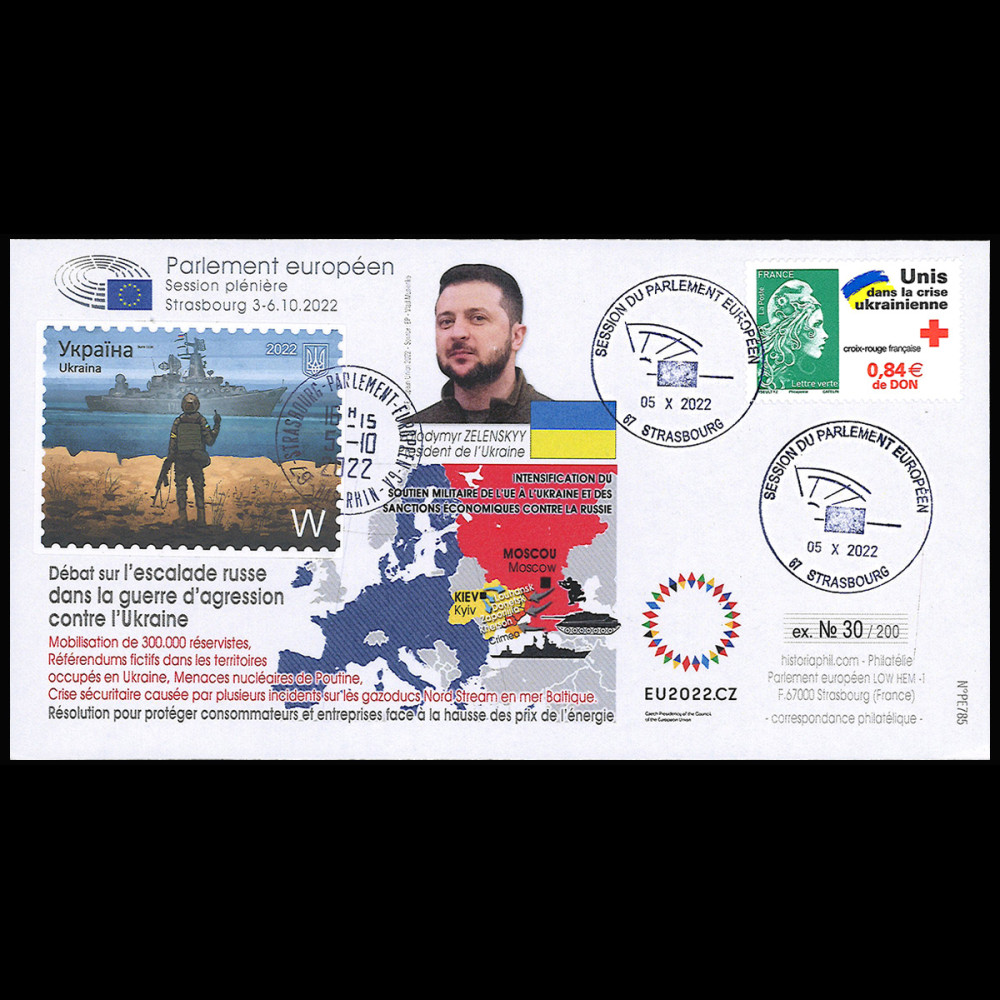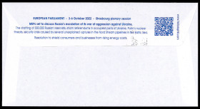 Une enveloppe philatélique, conçue par Historiaphil© (Kiosque de Philatélie du Parlement européen, Strasbourg, France) marque les grands thèmes d'actualité de la session plénière du Parlement européen, du 3 au 6 octobre 2022 à Strasbourg. Elle a été réalisée dans la continuité de la collection des enveloppes philatéliques témoignant depuis 1949, de l'histoire de l'Europe et de ses institutions. Son tirage est limité à 200 exemplaires numérotés.