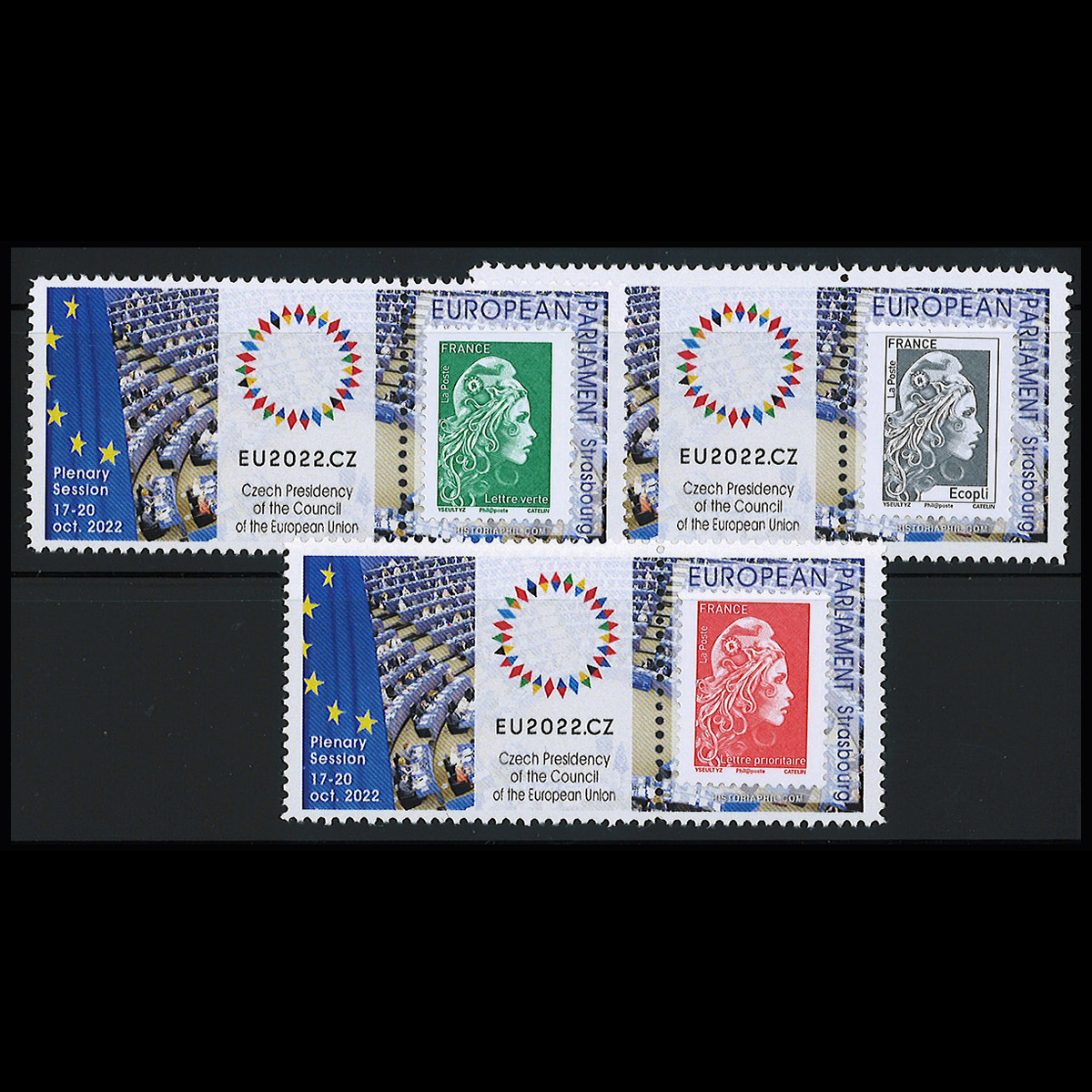 PE786PT : série de 3 porte-timbres (PT) DENTELÉS et gommés "Session du Parlement européen, Strasbourg (France) Octobre II 2022 - PRÉSIDENCE TCHÈQUE DU CONSEIL DE L’UE 2022"