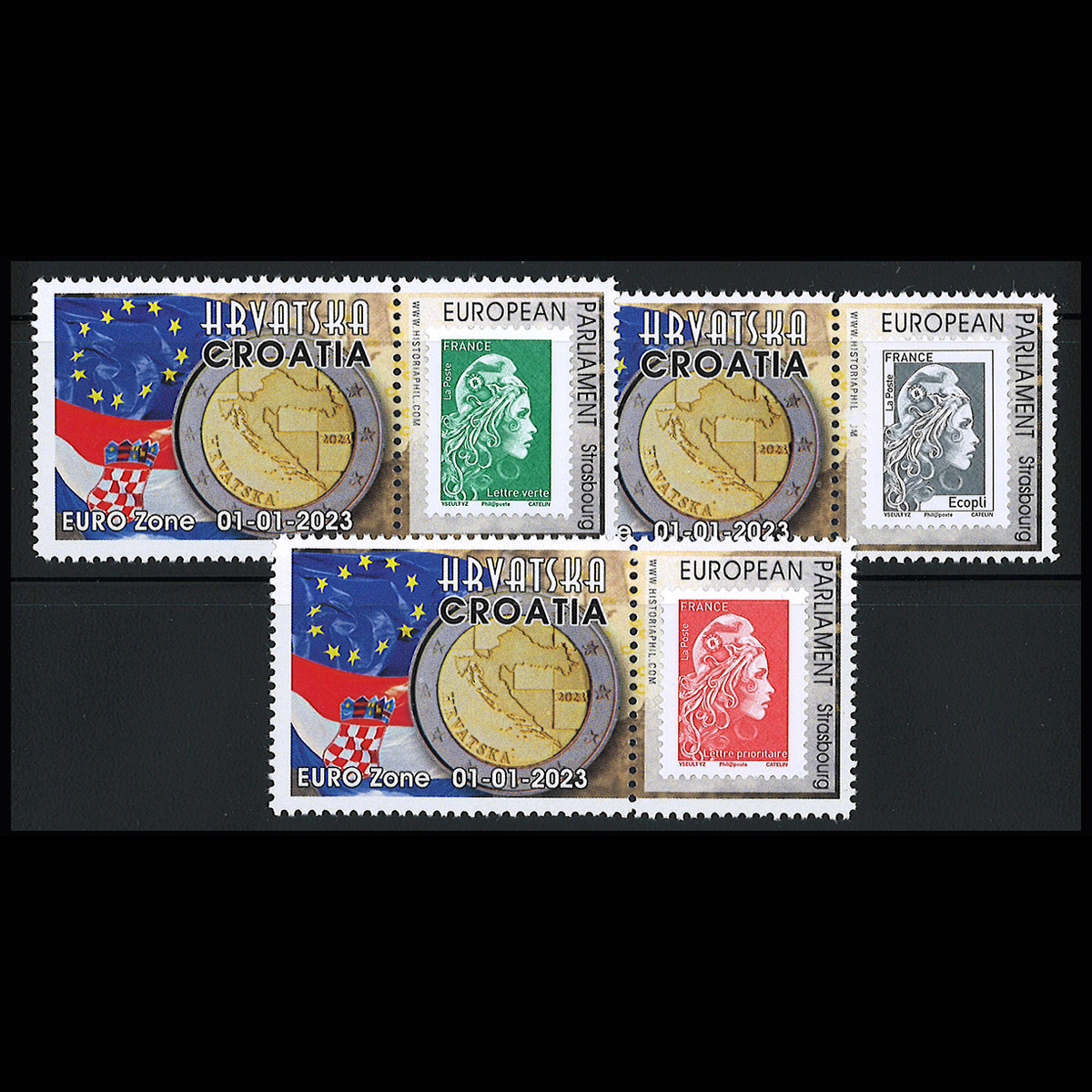PE789PT : série de 3 porte-timbres (PT) DENTELÉS et gommés "Session du Parlement européen, Strasbourg (France) Janvier 2023 - ENTRÉE DE LA CROATIE DANS LA ZONE EURO 01-01-2023"