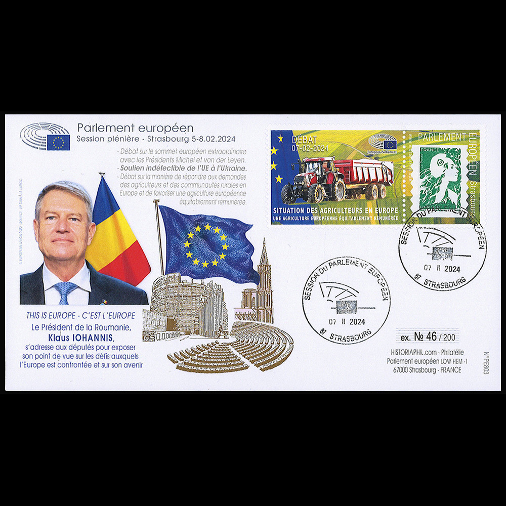- Affranchissement France LV 20g "Marianne de l'Avenir" sur porte-timbre dentelé “Parlement européen Strasbourg - Débat 07-02-2024 SITUATION DES AGRICULTEURS EN EUROPE"