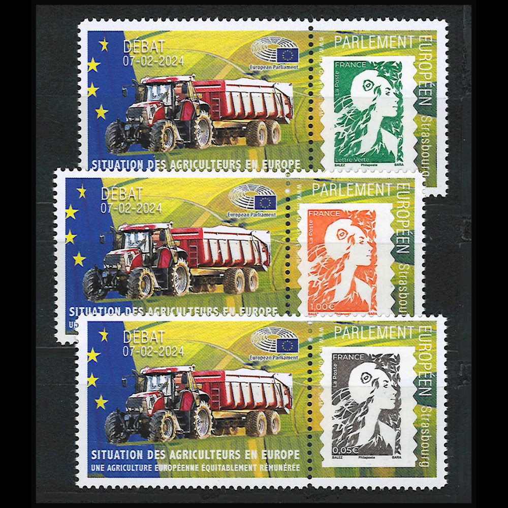N°PE803PT: set of 3 perforated and gummed stamp holders (labels) “Marianne - European Parliament Strasbourg - SITUATION OF FARMERS IN EUROPE - Fairly remunerated European agriculture - Debate 07-02-2024"
