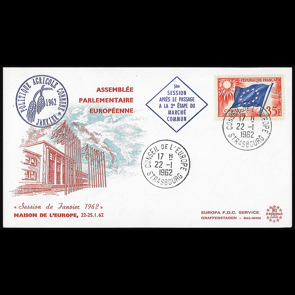- Cachets "POLITIQUE AGRICOLE COMMUNE - Janvier 1962" et "1ère session après le passage à la 2ème ÉTAPE DU MARCHÉ COMMUN"