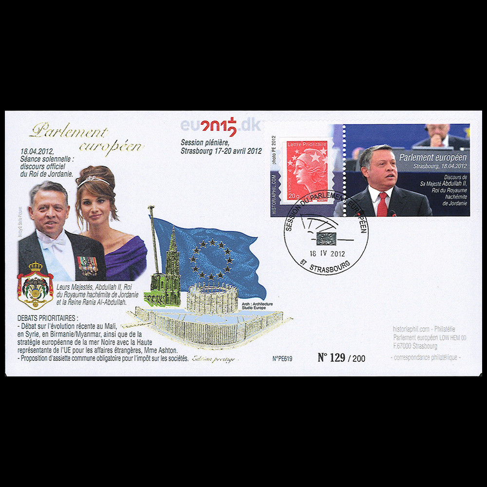 N°PE619T2: Prestige envelope FDC “Plenary session of the European Parliament, Strasbourg (France) 17-20.04.2012 - Formal Sitting of April 18: Official speech by His Majesty Abdullah II, King of the Hashemite Kingdom of Jordan - Her Majesty The Queen Rania Al-Abdullah.