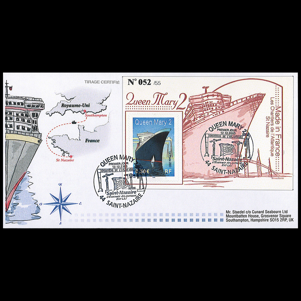 N°QM2-1 : FDC France 2003 “Lancement du Paquebot QUEEN MARY 2 - Timbre sur Bloc Chantiers de l'Atlantique”