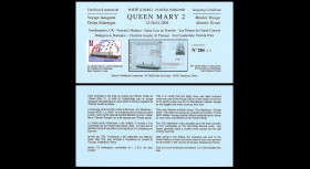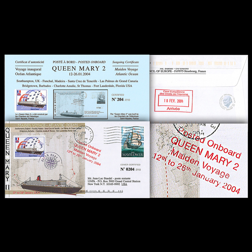 L'enveloppe porte le timbre-poste britannique "47p Mayflower - Europa 2003". Le "QM2" ne possèdant pas de bureau de poste à bord, c'est la griffe spéciale d'authentification du bord "Queen Mary 2 Maiden Voyage" qui a été apposée par l'Officier postal. Le timbre-poste britannique a été oblitéré à l'arrivée à Fort Lauderdale par les Postes américaines (Nota: les timbres sont tous marqués d'une éraflure provoquée par le tri mécanique du courrier).