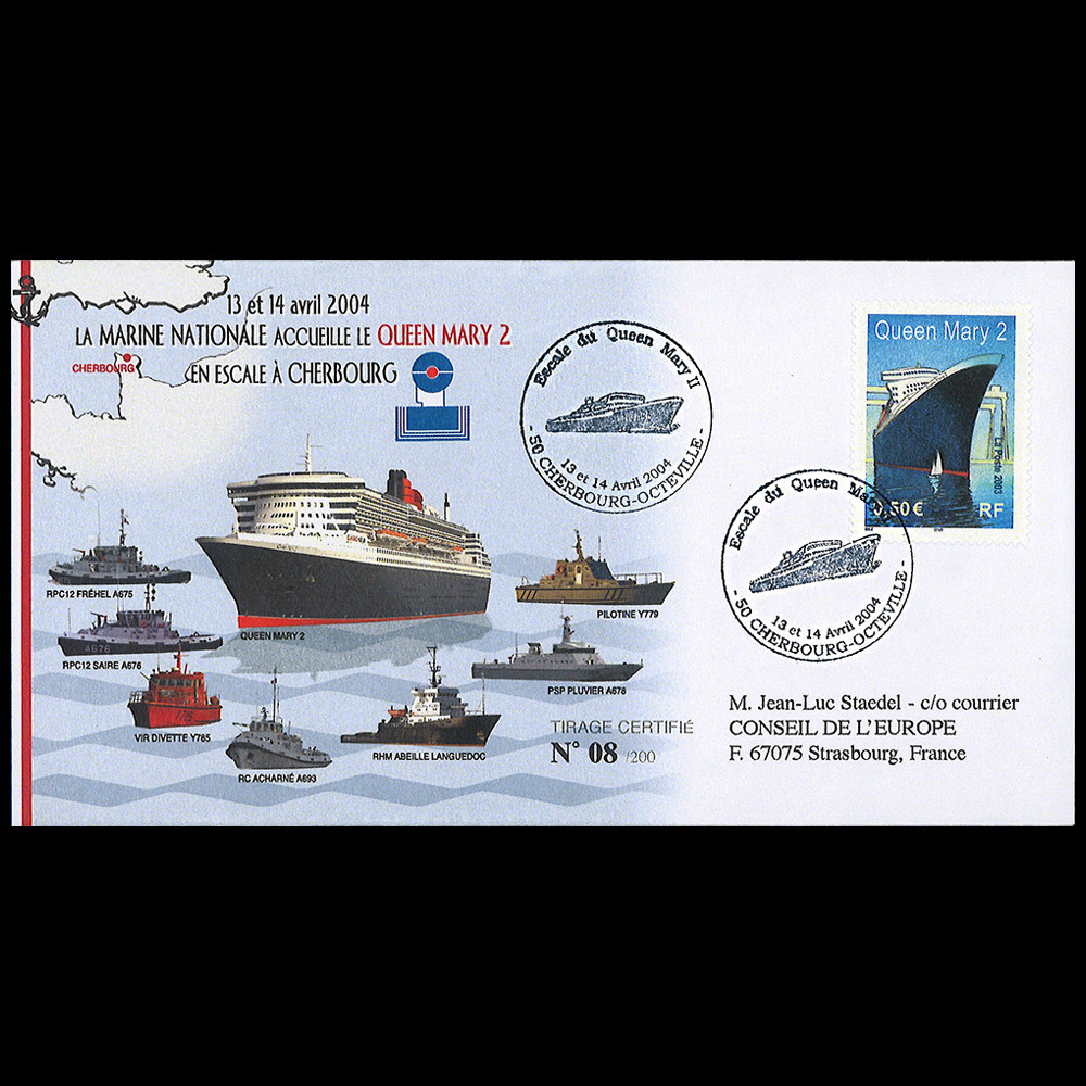N°QM2-6 : pli naval France 2004 “la Marine Nationale accueille le Queen Mary 2 en escale à Cherbourg, 13-14 avril 2004“