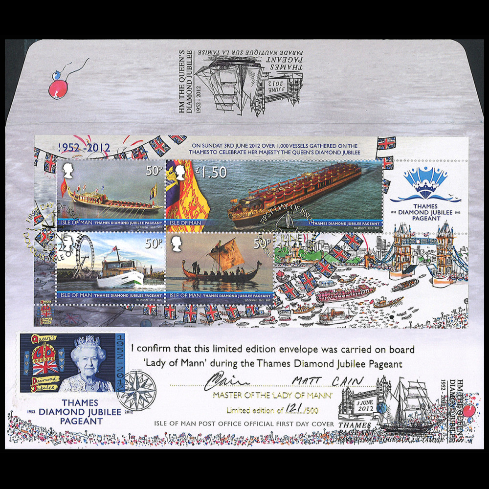 Affranchissement Isle of Man (Royaume-Uni) BLOC 3x 50p, 1£50 "Thames Diamond Jubilee Pageant". Oblitération Premier Jour à l’ENCRE D'OR "Douglas Isle of Man" 03.06.2012 du bureau de Poste naval installé à bord.