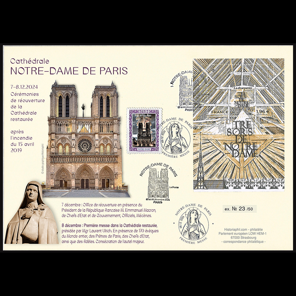 Le 7 décembre 2024, le team d'Historiaphil s'est rendu spécialement à Paris pour pouvoir faire oblitérer ses éditions philatéliques, réalisées en commémoration des cérémonies officielles de réouverture de la Cathédrale Notre-Dame de Paris restaurée. Le tirage limité de 50 exemplaires pour chaque type de document édité, en fait une rareté philatélique "Témoin de l'Histoire".