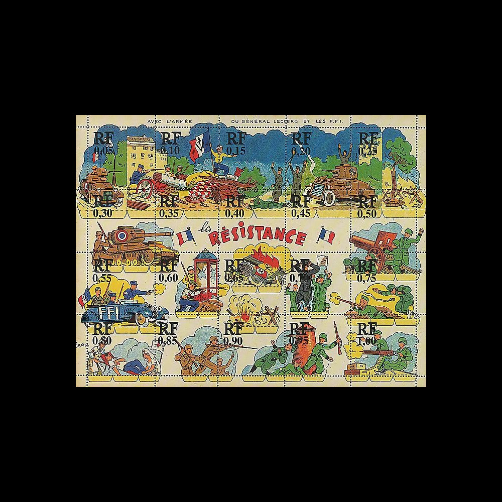 N°DEB 04-CS-RES : réédition d'une carte scolaire couleur de 1945 «La Résistance - avec l'armée du gal Leclerc et les FFI» (format 26x20 cm) illustrée de scènes de la guerre (char et soldats, prisonniers allemands, soldat blessé et infirmières de campagne...) composée de 20 vignettes dentelées surchargées 'RF' et valeurs de 0,05 à 1,00 papier carton non-gommé - rare