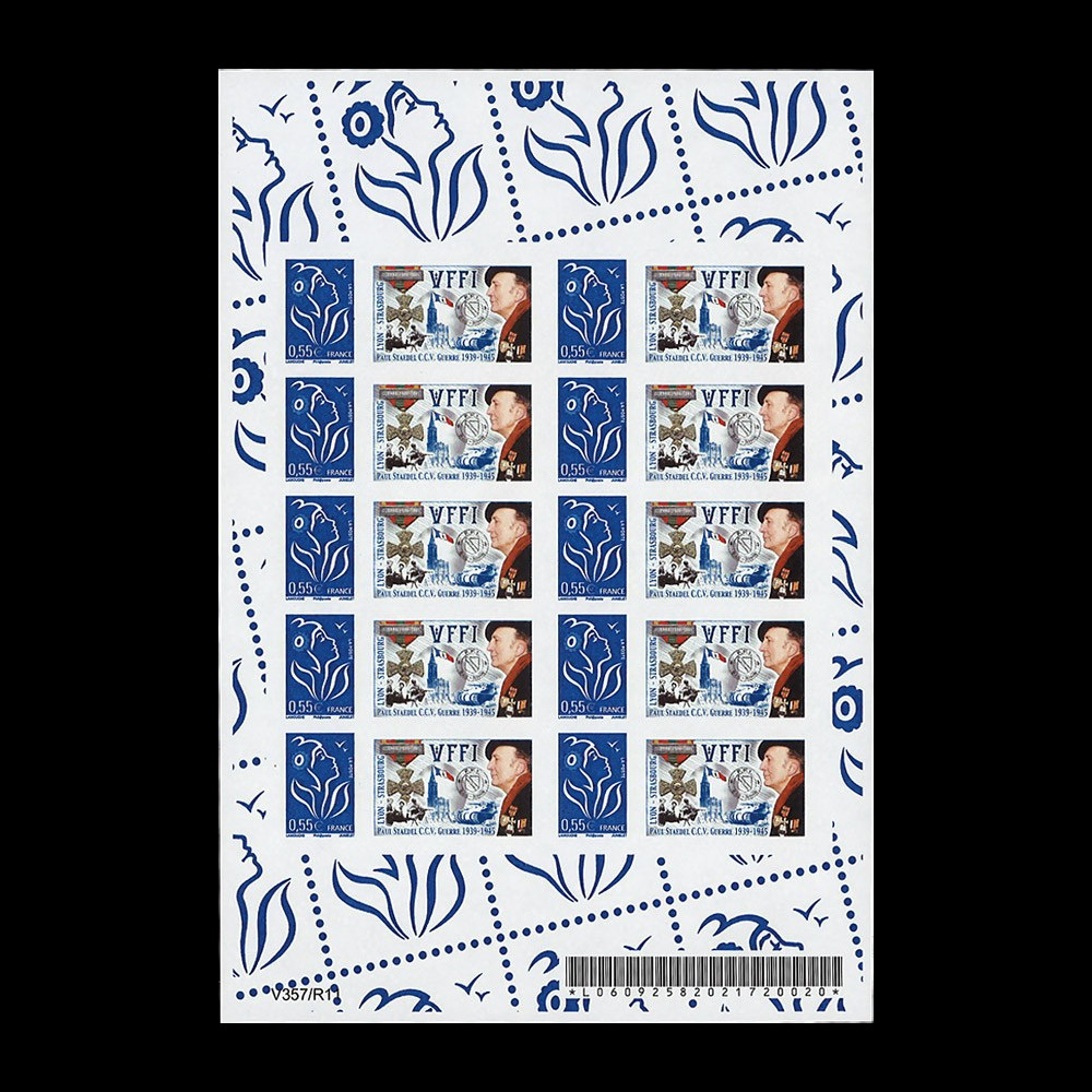 N°CCV39-45F : FRANCE Feuillet de 10 valeurs Timbre-poste personnalisé 0,55€ bleu “Marianne de Lamouche - Forces Françaises de l'Intérieur (FFI), Paul Staedel C.C.V. (Croix du Combattant Volontaire) durant la Seconde Guerre Mondiale 1939-1945 ” 2006 :