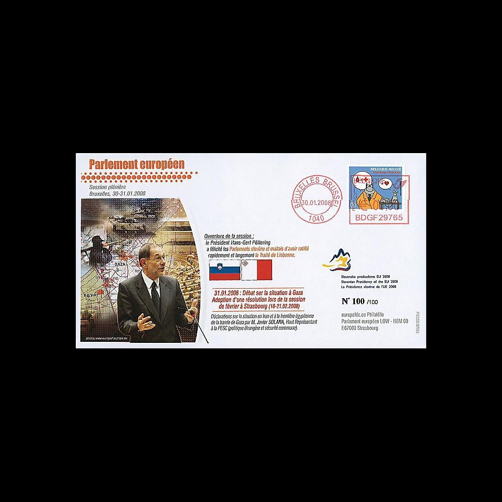 N°BR93-PE552 : FDC "session du Parlement européen de Bruxelles - janvier 2008" '- Ratification du Traité de Lisbonne par Malte et la Slovénie - Déclaration sur la situation en Iran et à Gaza par M. Solana, Haut Représentant de la PESC" 0,52 Belgique "Croix Rouge"