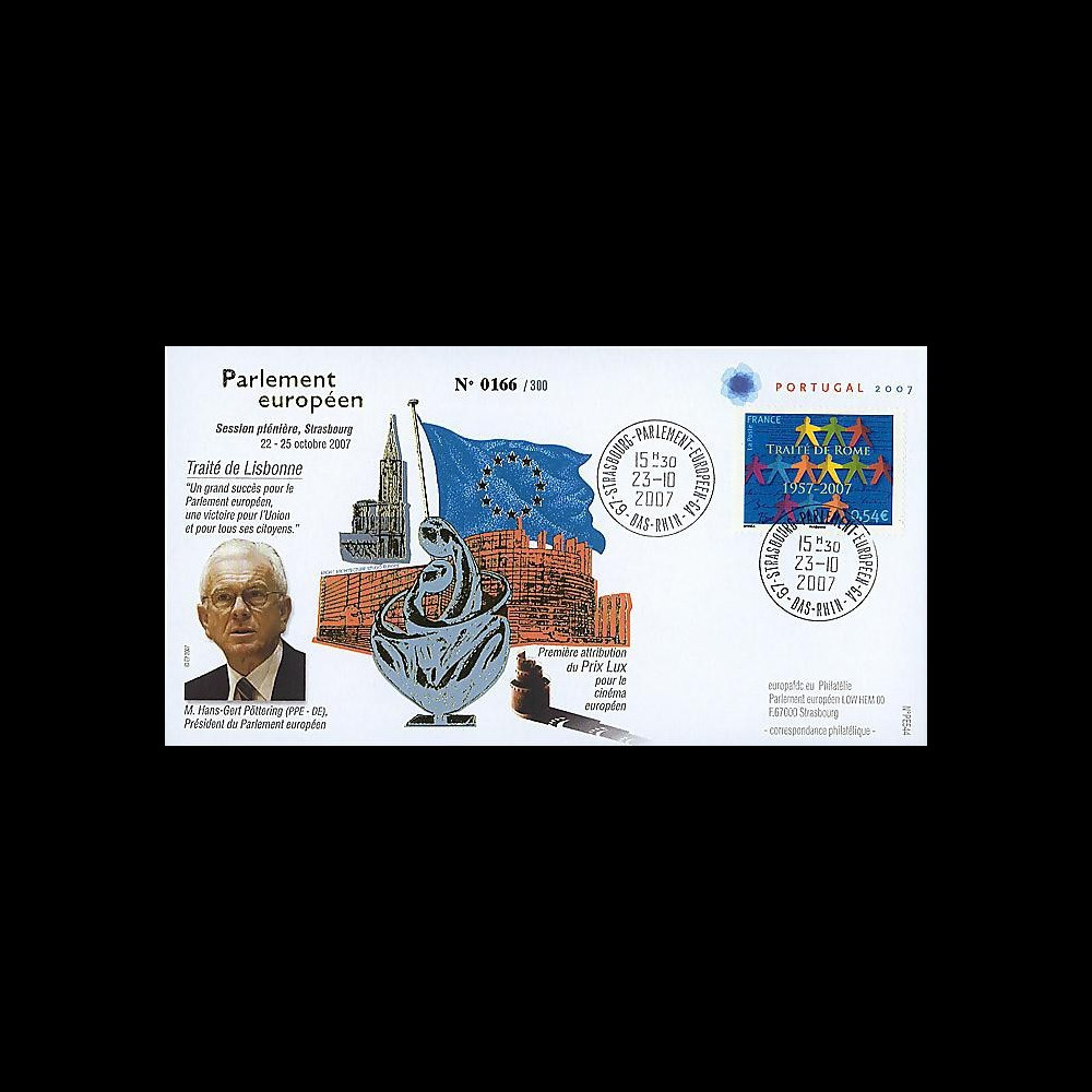 N°PE544 : enveloppe FDC Session du Parlement européen, Strasbourg 22-25.10.2007 'Traité de Lisbonne' 0,54 EUR 'Traité de Rome'