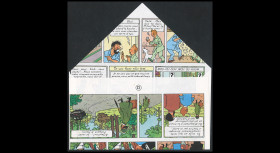 Pour les Tintinophiles et collectionneurs passionnés, nous avons voulu créer un «Premier Jour» original en façonnant artisanalement des enveloppes à pattes triangulaires, à partir de pages découpées dans d'authentiques albums des aventures de Tintin.