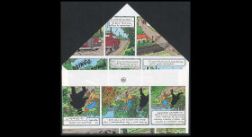 Pour les Tintinophiles et collectionneurs passionnés, nous avons voulu créer un «Premier Jour» original en façonnant artisanalement des enveloppes à pattes triangulaires, à partir de pages découpées dans d'authentiques albums des aventures de Tintin.