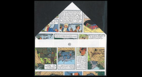 Pour les Tintinophiles et collectionneurs passionnés, nous avons voulu créer un «Premier Jour» original en façonnant artisanalement des enveloppes à pattes triangulaires, à partir de pages découpées dans d'authentiques albums des aventures de Tintin.