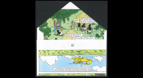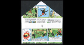 Pour les Tintinophiles et collectionneurs passionnés, nous avons voulu créer un «Premier Jour» original. Pour cela, nous avons démonté plusieurs albums des aventures de Tintin pour en récupérer les pages. De ces pages nous avons façonné artisanalement des enveloppes à patte triangulaire.